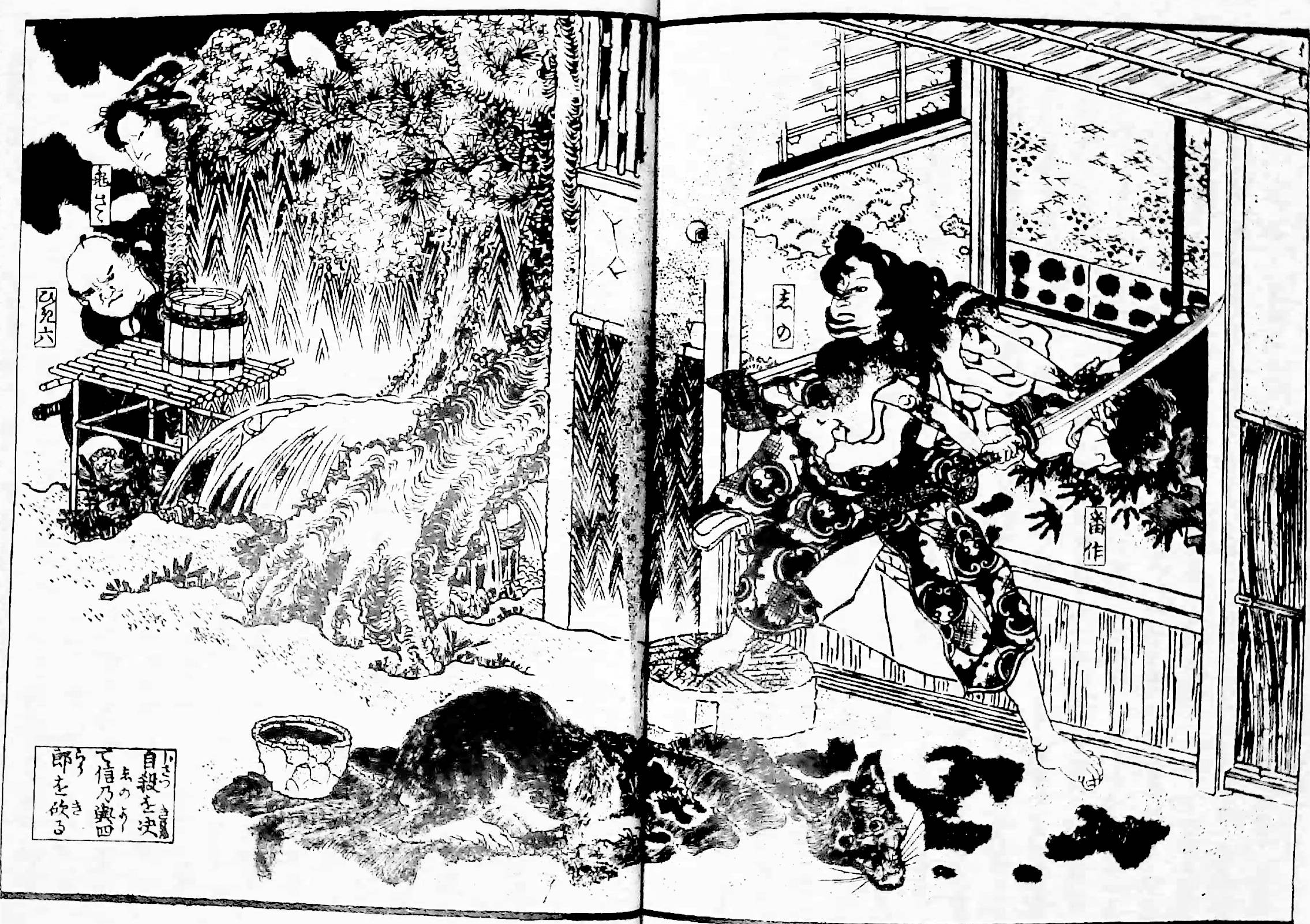 「自殺を决て信乃與四郎を砍る」「番作」「しの」「亀さゝ」「ひき六」
